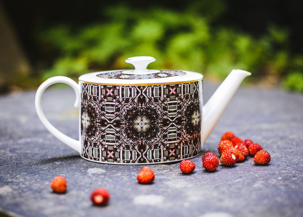 Inspired by the fabric and patina of this intriguing 19th. century garden – an exploration of the exquisite detail of original Victorian glasshouses, the eccentricities, the curiosities forgotten in old potting sheds – illustrated through mesmerizing sequences of colour, patterned texture and tone, this printed design series transports the garden, via the mystique of an immaculate kitchen, to the dining table.