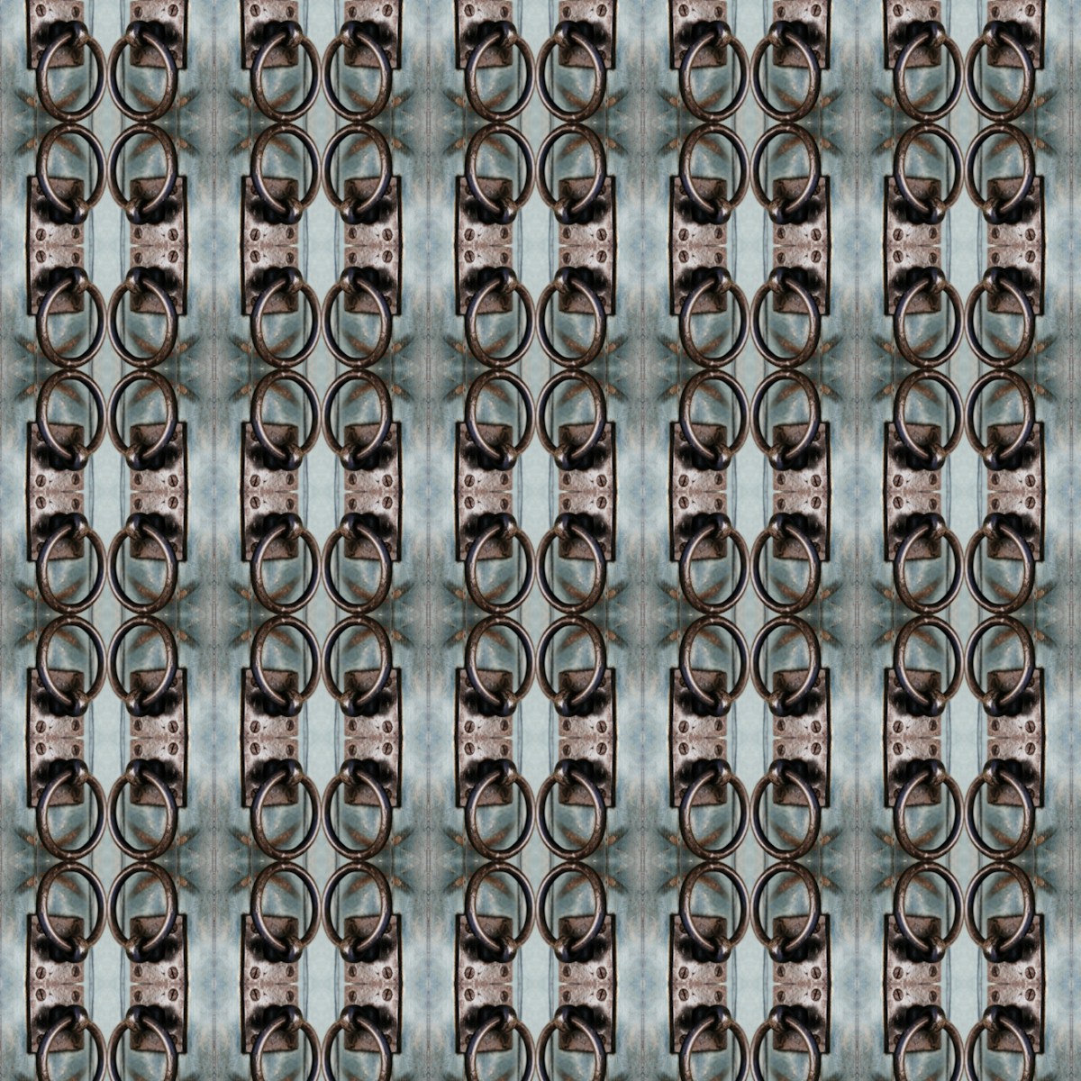 Fibonacci, where the latch of the Secret Garden gate is represented in a repeat geometric pattern of teal and bronze.
