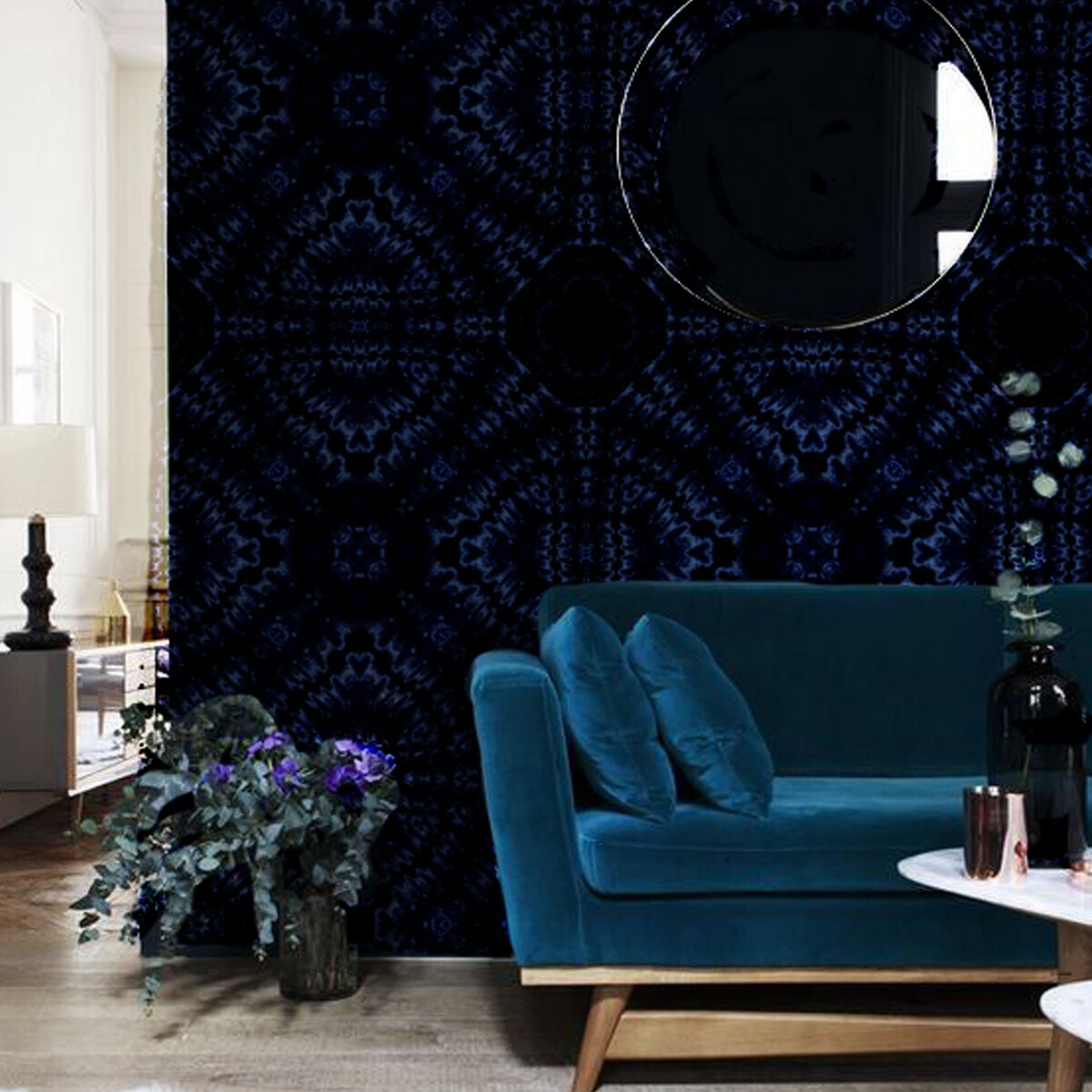 The dark imagery on this design is striking and one-of-a-kind. The dark blues are contrasted with the light creating a unique print that can be the main feature of an understated and simple room.