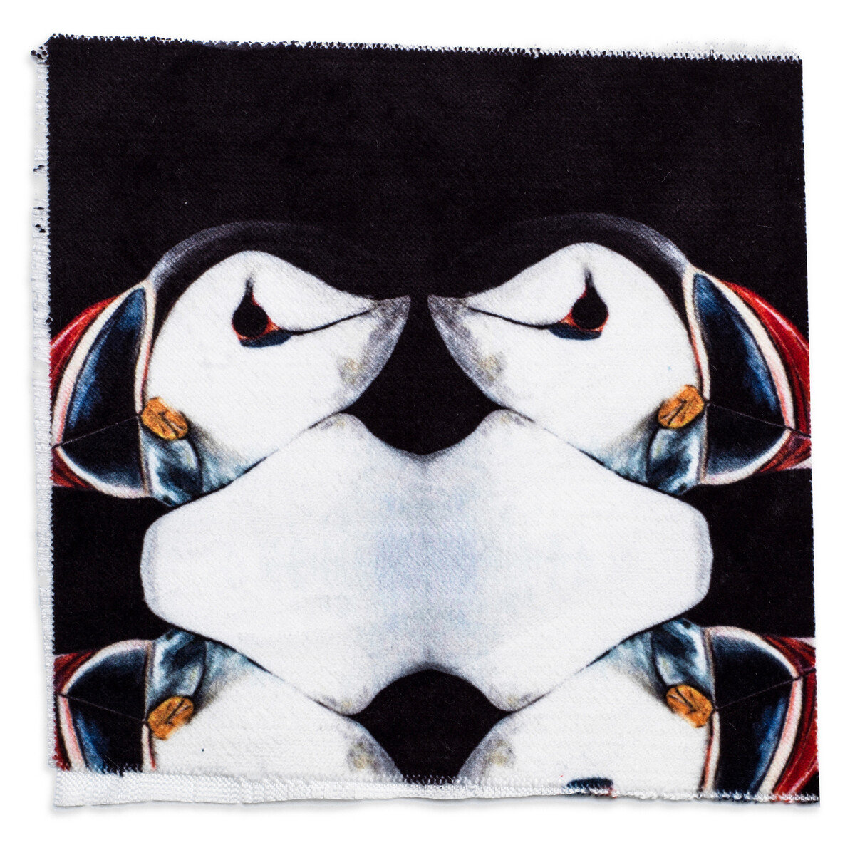 Tammie Norrie depicts puffins from the Isle of Shetland in all their vibrant glory. A signature Iona Crawford artwork and a little daring in aesthetic, akin to the feisty wee birds from which it is inspired. Hand painted by Iona, the inky black and milky white tones are contrasted with bright reds to create a statement print, rich with intrigue.