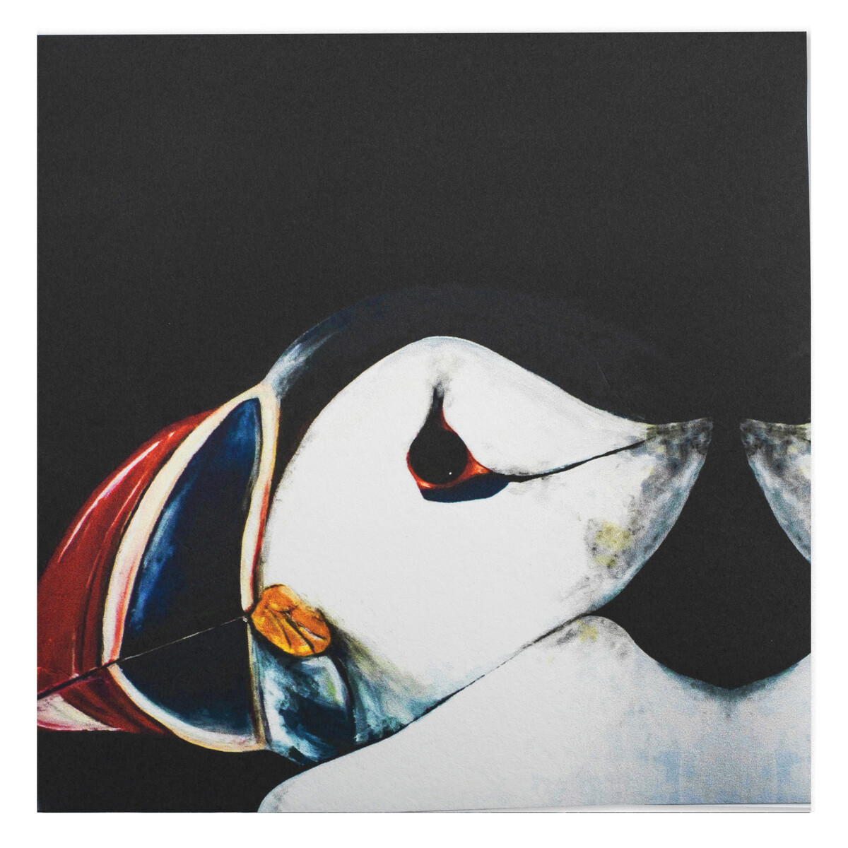 Tammie Norrie depicts puffins from the Isle of Shetland in all their vibrant glory. A signature Iona Crawford artwork and a little daring in aesthetic, akin to the feisty wee birds from which it is inspired. Hand painted by Iona, the inky black and milky white tones are contrasted with bright reds to create a statement print, rich with intrigue.
