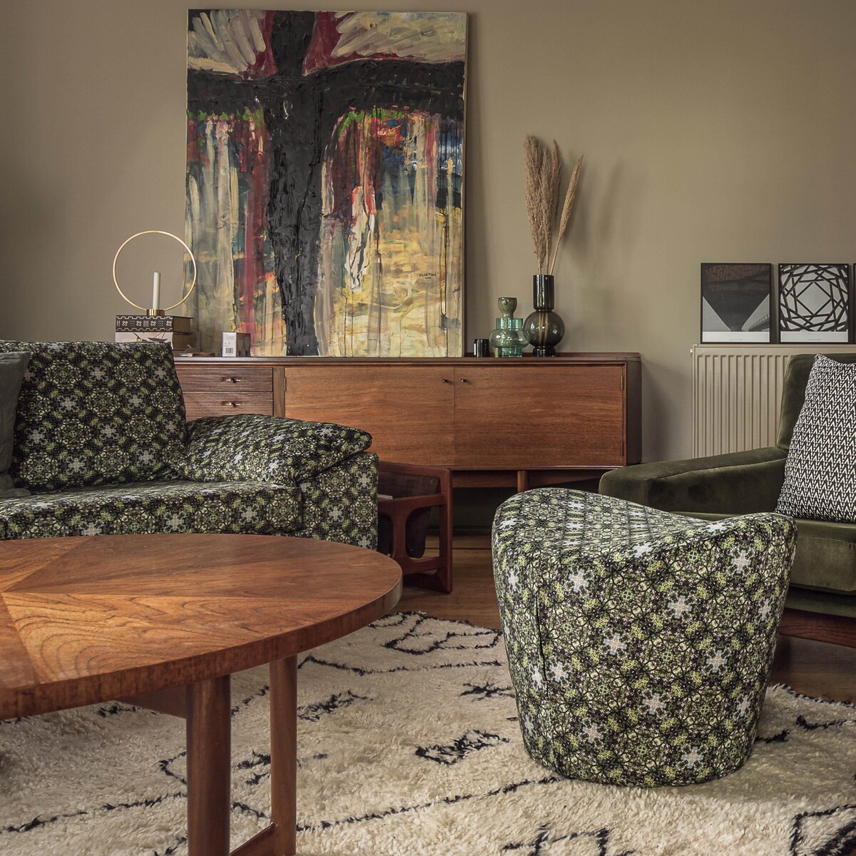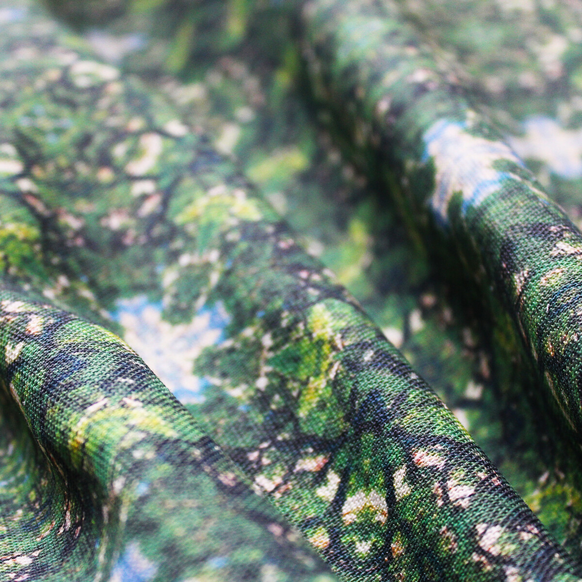 The green kaleidoscopic print, interjected with colours of blue and black, is reminiscent of a green house. The burst of different colours and shapes make this print a celebration of nature.