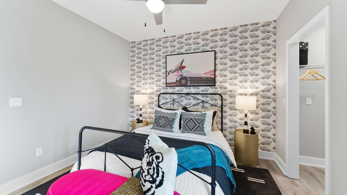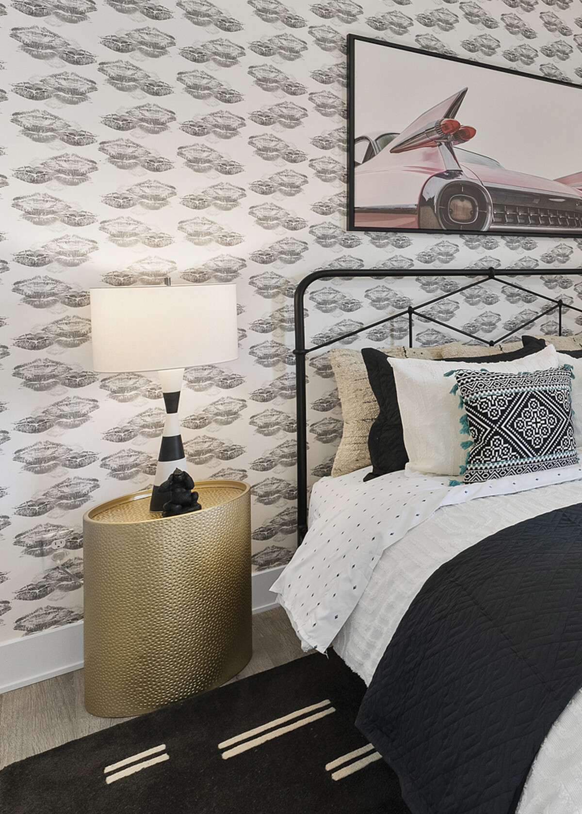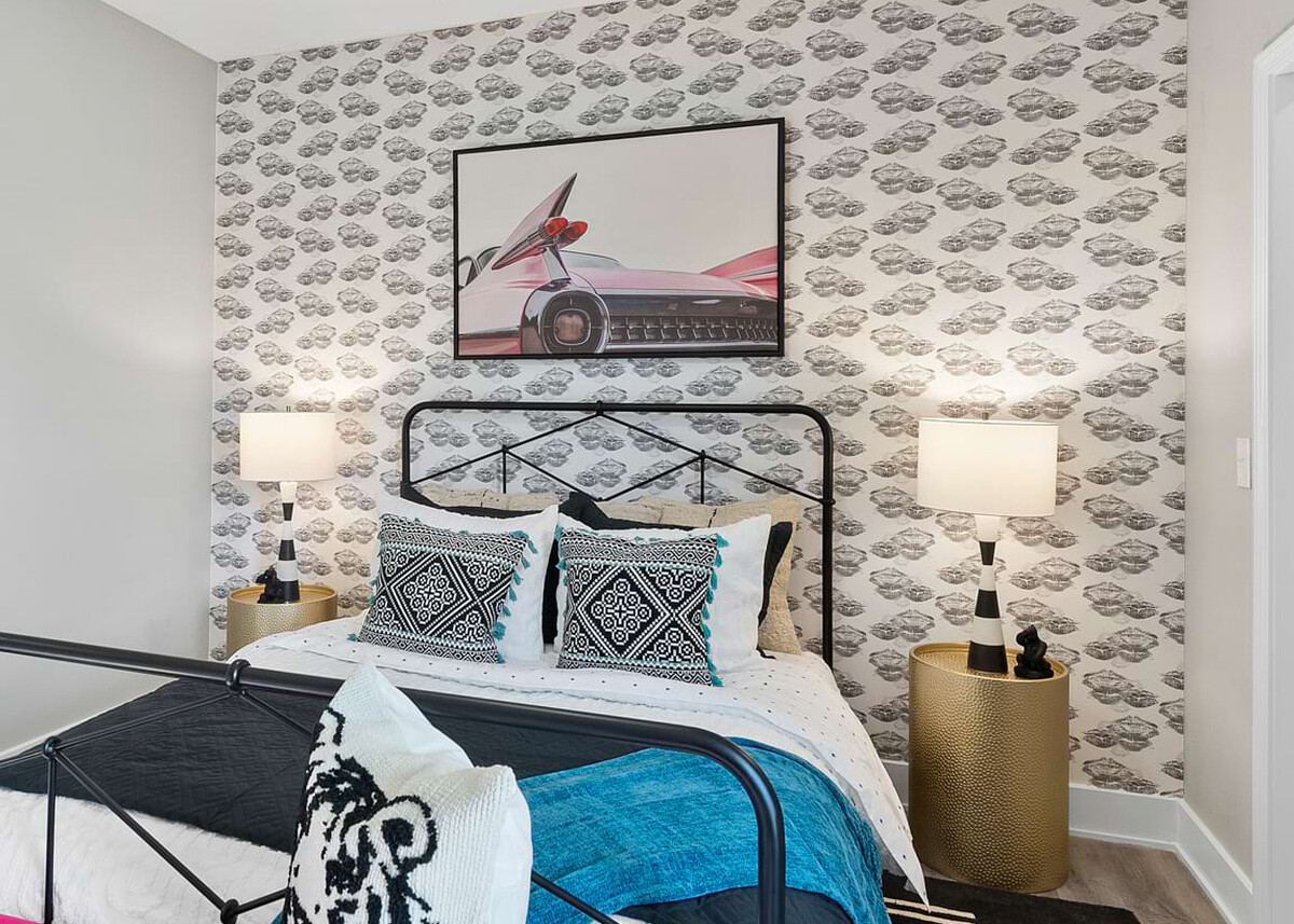 The Cortland Design team are sure to bring a pop of fun and vibrancy in to your every day living space. We think our Percept at Dawn wallcovering makes for the perfect print paired alongside these bold colours and textures within the master bedroom.