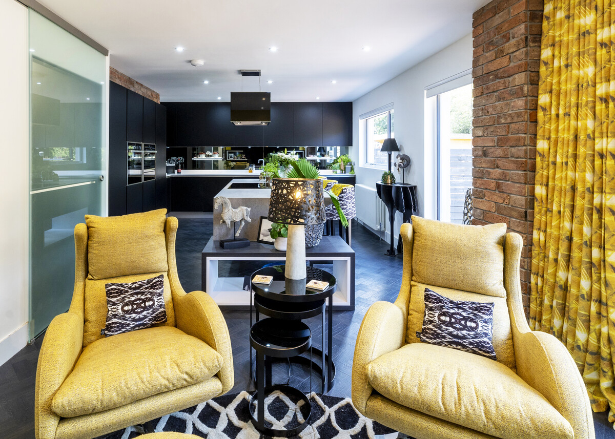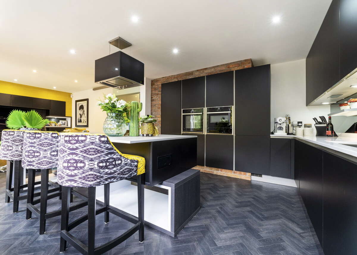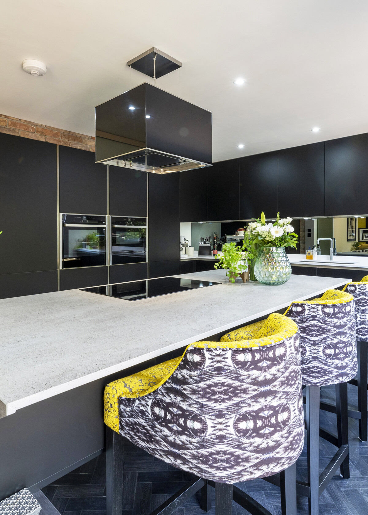 Beautiful Twine and sunshine yellow bar-stools within a modern kitchen scheme masterminded by the talented Deborah Bell.