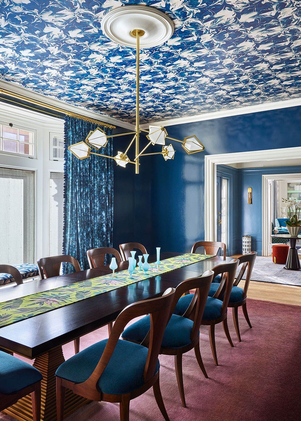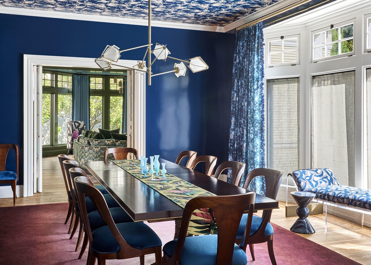 This family home stays true to the classical architecture whilst adding a colourful aesthetic. The Jeff Schlarb team filled the home with artistic touches both vintage and contemporary including statement wallpapers, hand painted ceilings, custom furniture, collectible pieces and layered pattern, colour and texture.