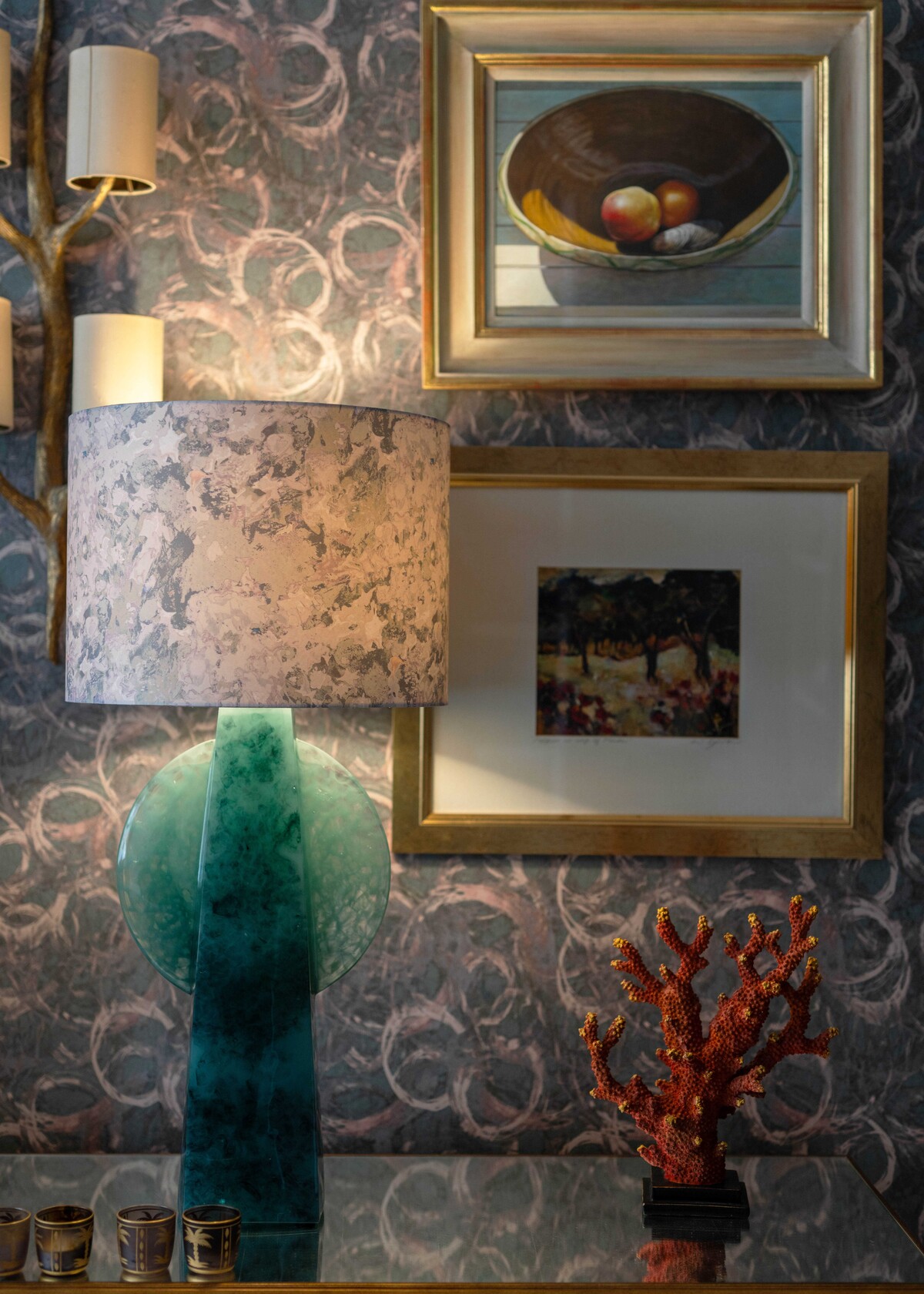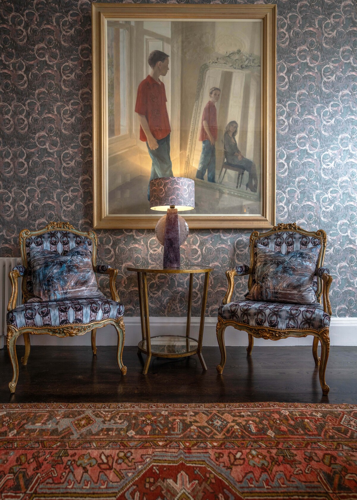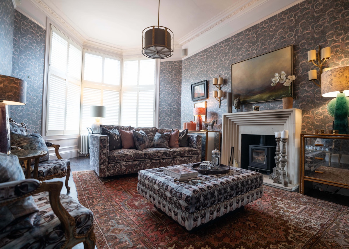 Step into the re-imagined grand living room, where elegance and comfort harmonise effortlessly. Oversized art pieces adorn the walls, adding a touch of contemporary flair to the classic architecture. A soft colour palette paired with clashing patterns allows for Air Haze and Fibonacci to marry in a dance of designs.